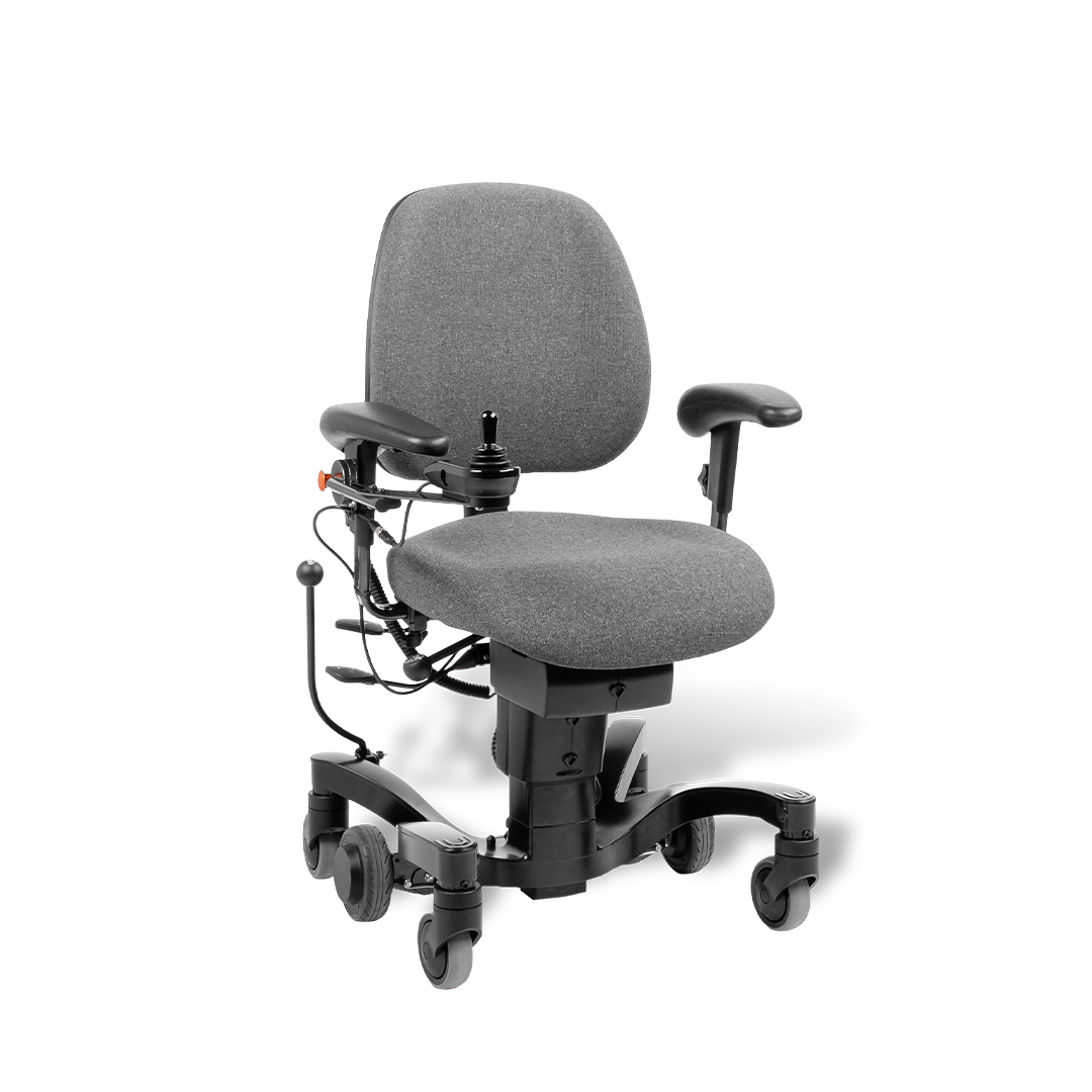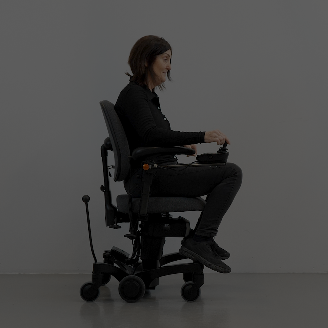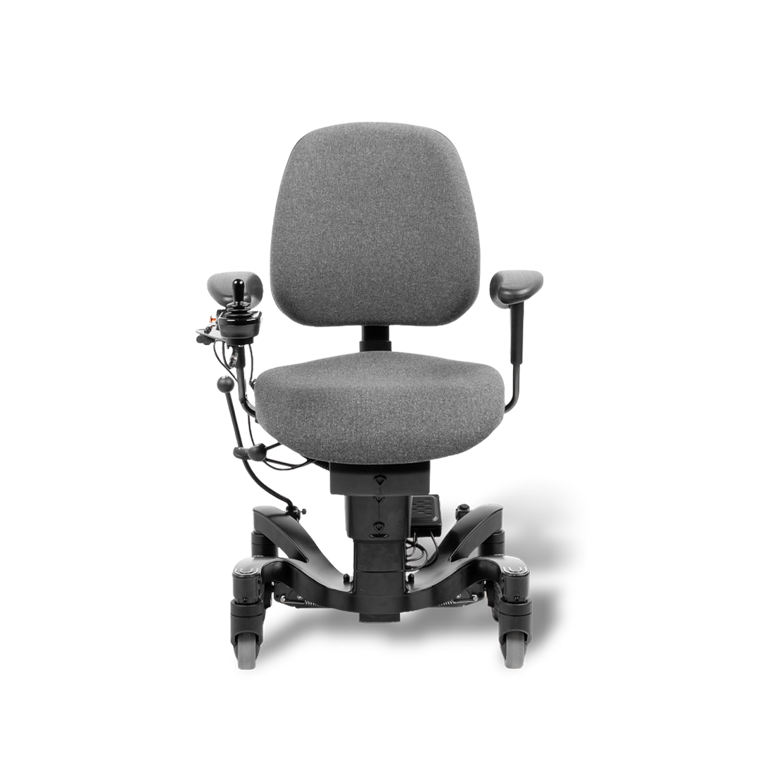 The joystick mount can be adjusted so that the positioning of the on/off switch and the directional controller suits your needs. With a single press of a button, the mount can be folded down, so it is not in the way when you need to get close to the table, for example, at mealtime.